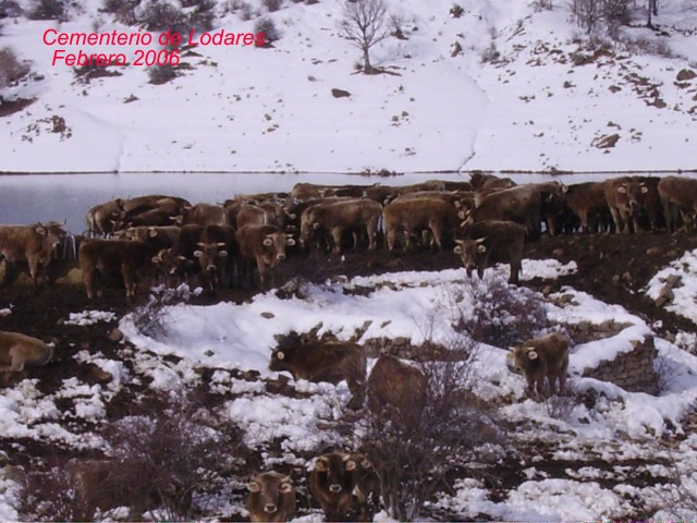 Ocurre que esa superficie hormigonada es la zona más cómoda que en los últimos años ha encontrado el ganado para sestear, y sus cuidadores para echarles de comer en invierno (ver foto) sin que nadie vigile ni prohíba que esto sea así. Al ser importante el número de reses de vacuno que transita por allí (ver imagen), la solera de hormigón se ha deteriorado en exceso, por lo que de no tomarse medidas de inmediato, pronto veremos de nuevo restos por su entorno. Y como una imagen vale más que cien palabras, ahí quedan dos fotografías hechas en este mismo año, donde se observa claramente lo que manifiesto. Ante esto, no es difícil imaginar el dolor añadido que esta situación nos aporta a aquellos que tenemos allí a nuestro padre, a nuestra madre, a nuestros hijos, a nuestros abuelos, etc…, a los que ni tan siquiera podemos honrar, como es común en este país el día de Todos los Santos, cuando creyentes o no creyentes, cogen camino del cementerio para homenajear a sus muertos con flores, con cánticos, con oraciones, con silencios …, que esto cada uno lo puede hacer como quiera, pero nosotros no podemos ni acercarnos, pues nuestro “campo Santo”, nuestro cementerio, no es que esté cubierto por una losa de agua, es que está cubierto de toneladas de estiércol por culpa de un trato irresponsable de parte de quien sea, haciendo imposible el acceso si no es a riesgo de morir atollado en el intento.